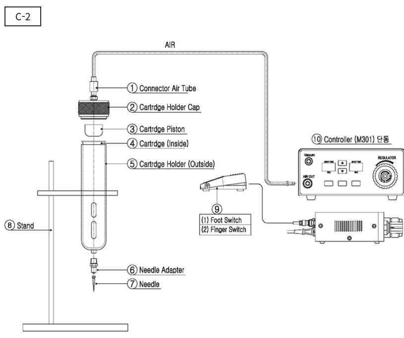 Air를 조절하여 액체면에 투입시켜 토출하는 방법으로 시간, 압력 Needle Size를 선택하여 임의로 토출량을 조절하는 시스템이며 300ml용량의 카트리지를 카트리지 홀더에 넣고 토출합니다.