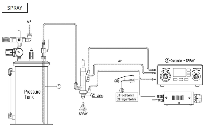 Air를 조절하여 액체면에 투입시켜 토출하는 방법으로 시간, 압력, Needle Size를 선택하여 임의로 토출량을 조절하고 스프레이 전용 밸브를 사용하여 분포합니다.