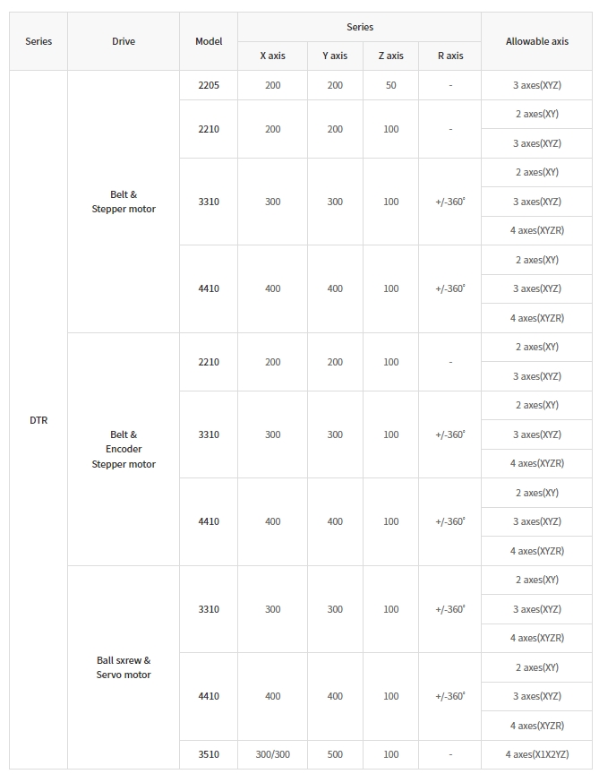 - 2축(XY), 3축(XYZ), 4축(XYZR) 가능